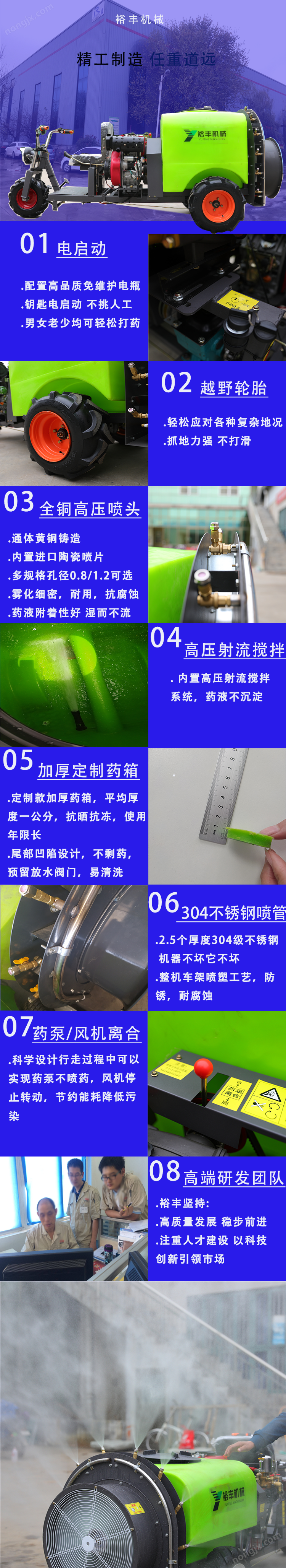 行走噴藥一個發動機帶動,乘坐式高舒適度設計,高配置電啟動,機器不挑人,男女老少均可操作,大大節省人力成本;