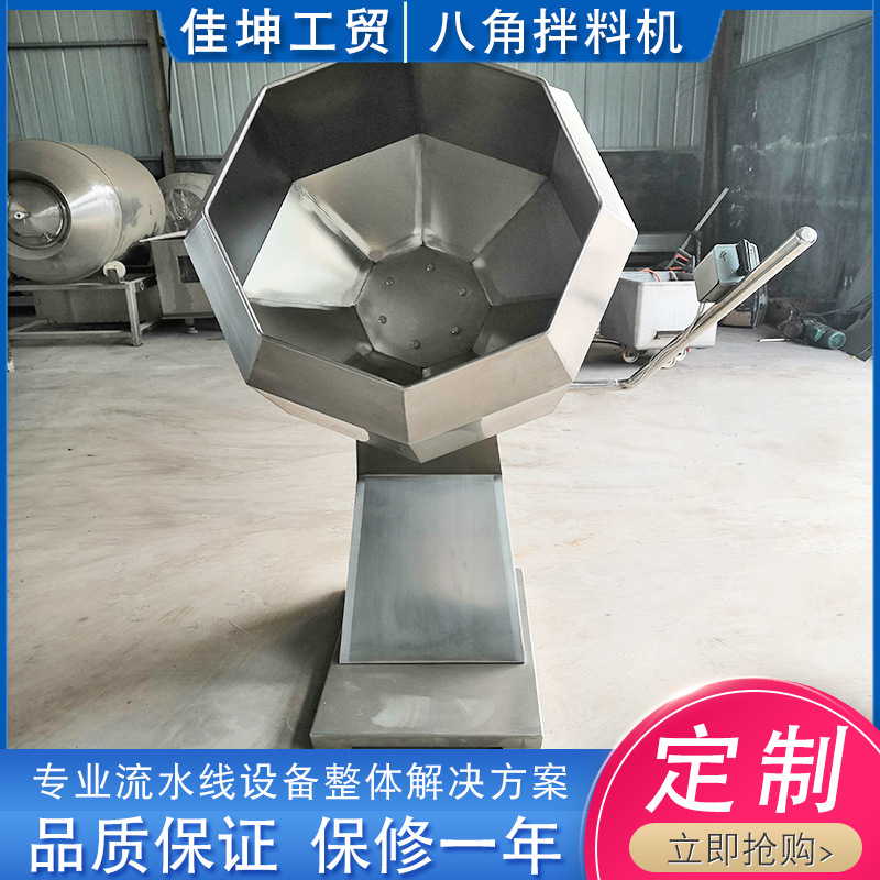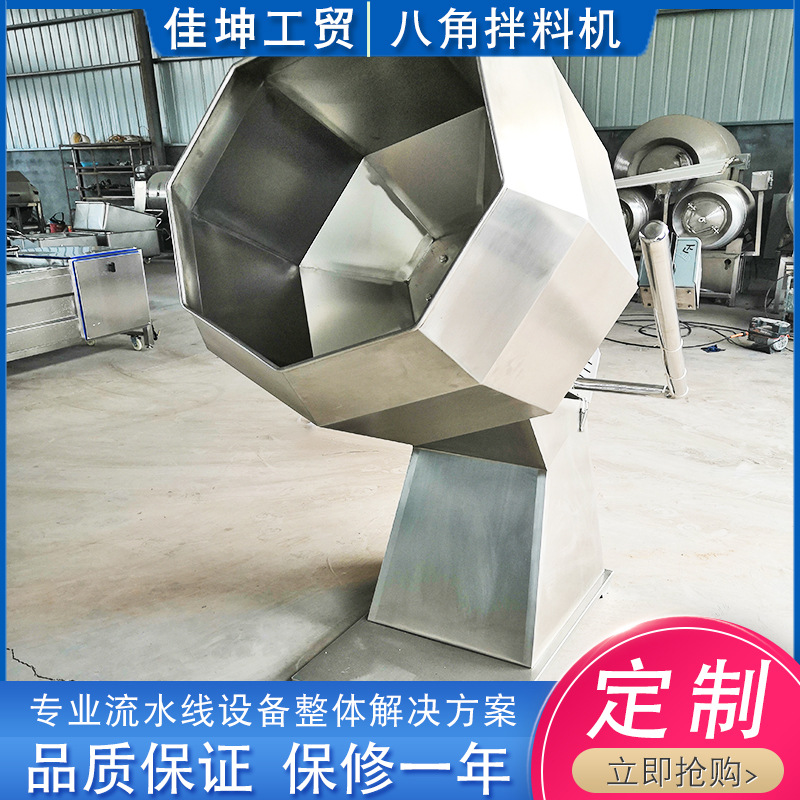 拌料機可將各種原料肉與淀粉、輔料、水等進行攪拌和混合。八角多角拌料機自動拌糖、拌料機拌糖、拌料均勻,食品不宜碎,出料時多余的糖、料粉與產品自動分離,一個人操作,省工省時,每小時可生產400-600kg。