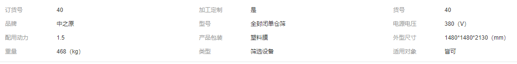 技術參數 規格 | 篩理面積(㎡) | 產量 (t/h) | 動力 (kw) | 回轉直徑 (mm) | 轉速 (r/min) | 重量 (kg) | 尺寸 (mm) |