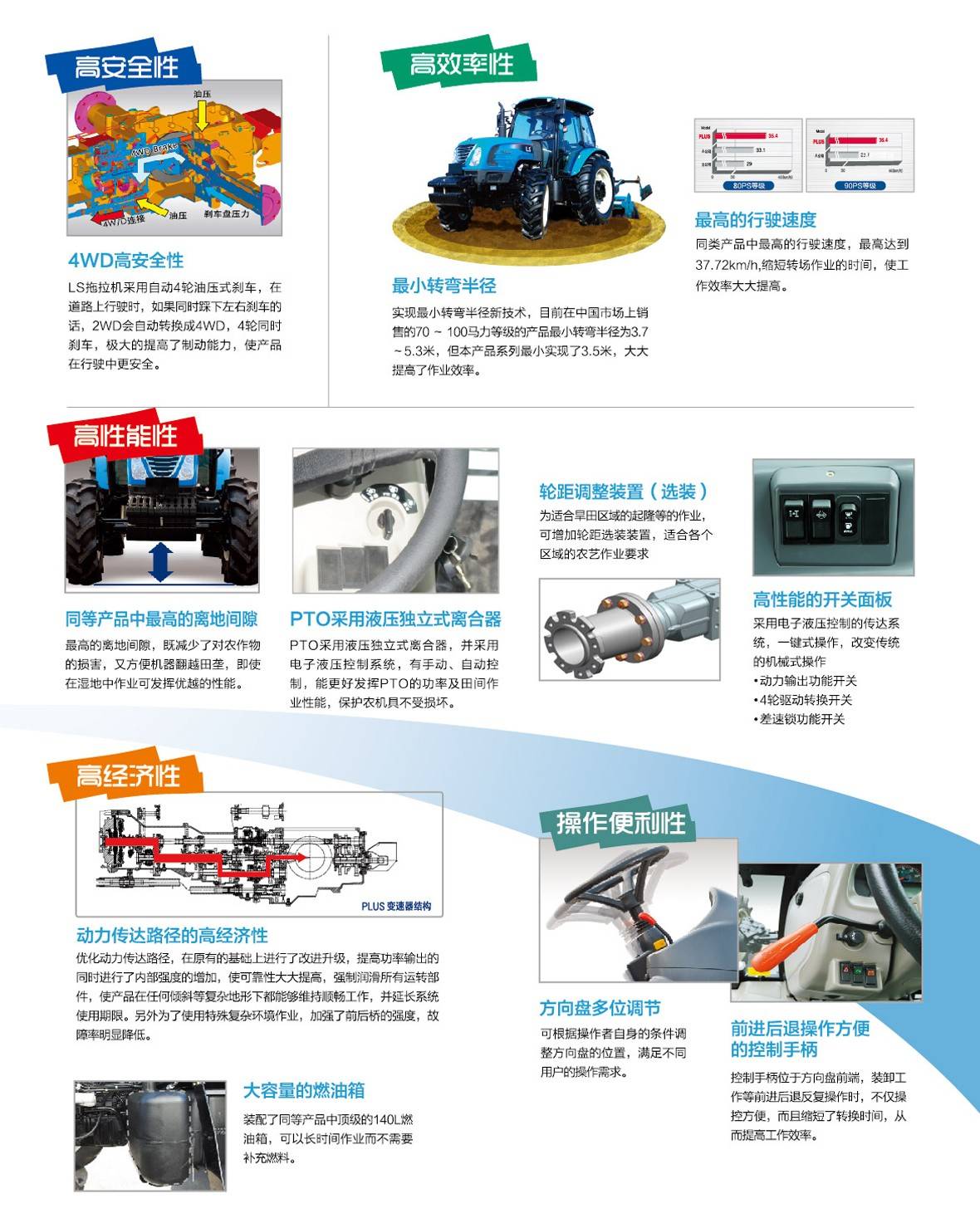 2、LS 拖拉機采用自動4輪油壓式剎車,在道路上行駛時,如果同時踩下左右剎車的話,2WD會自動轉(zhuǎn)換成4WD,4個車輪同時剎車,極大的提高了制動能力,使產(chǎn)品在行駛中更安全。