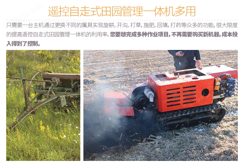 智能遙控式田園管理一體機KGYL588-1實現智能遙控操作,可實現轉向、停止與行走、機具升降功能,適合果園和大棚作業時空間受限和對人身有危害的特殊環境作業;產品體積小,樹叢間通過性能好,操作靈活;采用履帶式行走設計,坡地、坑洼地通過性能強,抓地能力強、牽引力大;一機多用,可滿足旋耕、開溝、施肥、回填、除草、推土、噴藥、秸稈還田、升降平臺、平臺運輸、犁地、碎枝、起壟等多種功能作業。