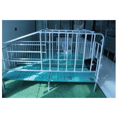母豬產床又稱高培產仔欄,主要由母豬定位架、仔豬圍欄、仔豬保溫箱、漏糞地板、母豬食槽和小豬補料槽等組成。 母豬定位架的作用是控制母豬自由活動區域和躺臥方式,母豬產床定位架之間有擋杠,避免仔豬被壓死、踩死和壓傷。定位架的長度一般為2.1-2.3米,寬度為0.6米,高度為1.0米。限位架*下邊的一根欄桿上面焊有彎曲的檔柱,用以保護仔豬,而不影響仔豬吃奶。母豬食槽和飲水器都在定位架的前方。