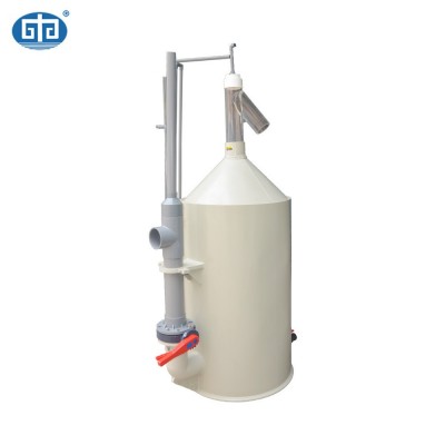 蛋白質(zhì)分離器是由離心旋流過濾裝置、十字布水裝置、反應(yīng)室、泡沫收集管、射流進(jìn)氣組件、底部排空、臭氧加注、出水及工作液位調(diào)整等部分組成,具體處理流程為:需要處理的水體在進(jìn)入離心旋流過濾裝置,在旋流離心力的作用下,大的顆粒物和細(xì)小的污物由旋流排污口排出(約進(jìn)水量15%),經(jīng)旋流過濾處理后85%水進(jìn)入十字布水裝置進(jìn)行均勻布水,布水后水緩慢流入反應(yīng)室,期間射流器裝置同時(shí)工作,吸入空氣,在水氣混合中產(chǎn)生大量微細(xì)氣泡。在水、氣、粒三相混合的體系中,不同介質(zhì)的相表面上都因受力不平衡而存在界面張力,當(dāng)微氣泡與固體懸浮顆粒接觸時(shí),由于表面張力的作用就會(huì)產(chǎn)生表面吸附作用。微氣泡向上運(yùn)動(dòng)時(shí),水中的懸浮顆粒和膠質(zhì)(主要是養(yǎng)殖生物的殘餌及排泄物等到有機(jī)物)便附著在微氣泡表面上,造成密度小于水的狀態(tài),利用浮力原理使其隨氣泡向上運(yùn)動(dòng),并聚積在上部水面,隨著微氣泡的不斷產(chǎn)生,聚積的氣泡不斷推積到頂部的收集管中被排出。