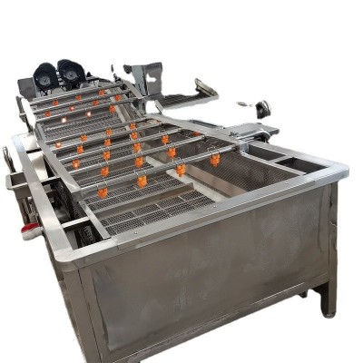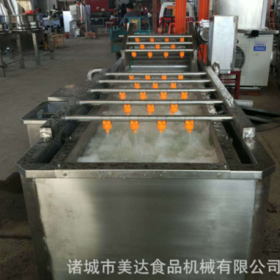 氣泡清洗機是大棗,蔬菜,水產生產線中的重要產品,主要用于大棗,蔬菜,水產的清洗。氣泡清洗機的原理主要是利用箱體前部分設備箱體中注適量的水,經過加熱管將水溫加熱,原料在經過箱體時,會與氣泡機和水的結合作用下做翻滾狀態,并隨網帶不斷向前推進,在出水面時,高端設有噴淋頭,高壓沖洗。                                                                                                                                                                 果蔬氣泡清洗機特點: